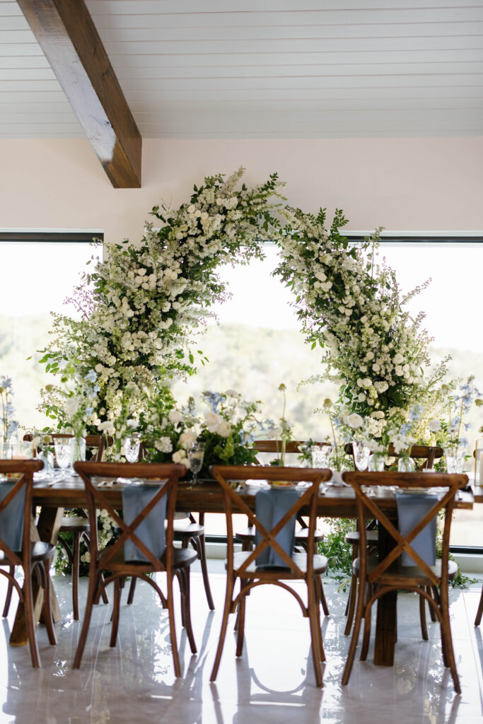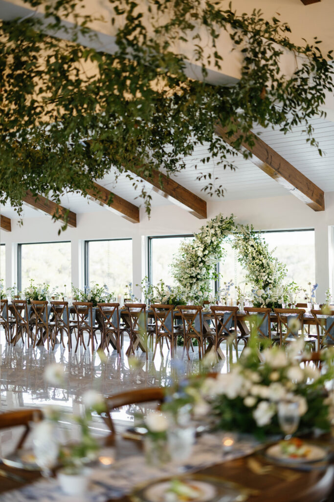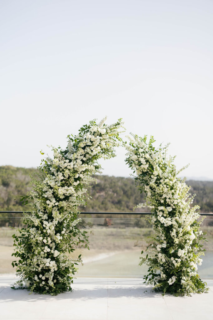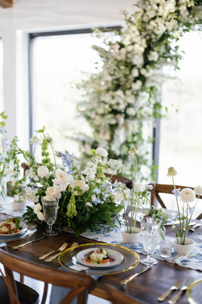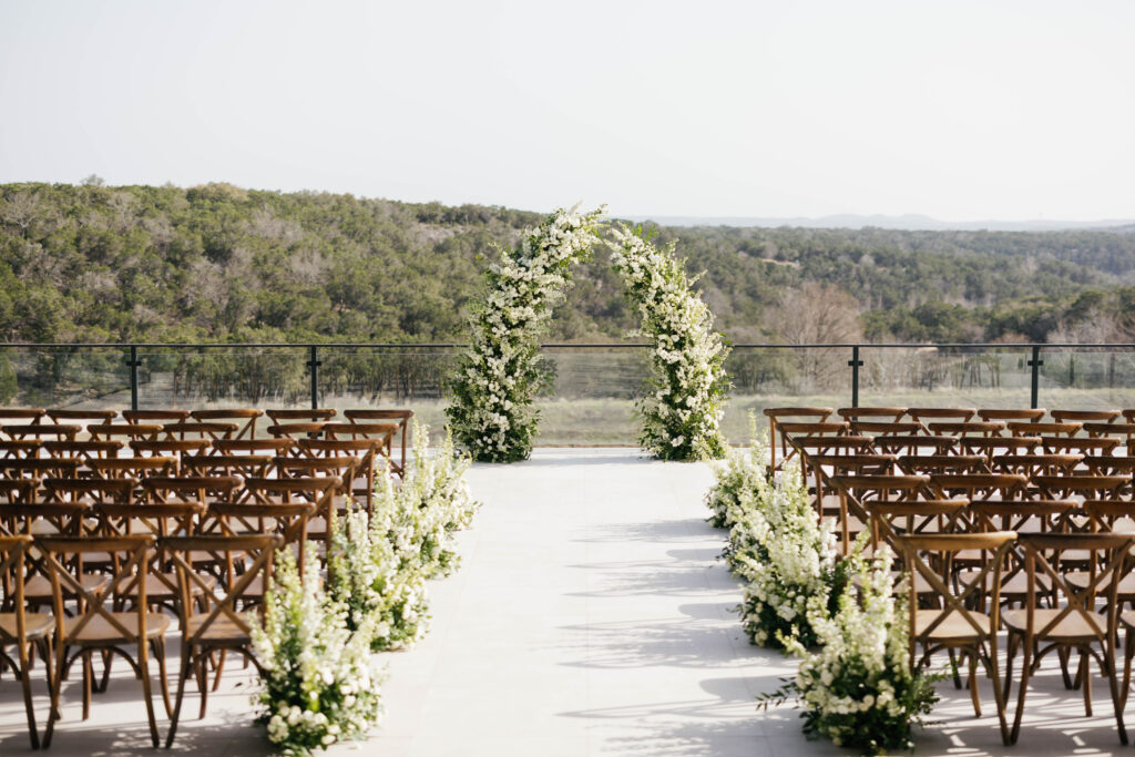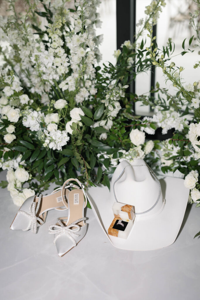 The design leaned into creamy whites and soft neutrals, letting texture and shape do the talking. Think cloud-like white florals, crisp linens, and that “bright sunny skies” glow that makes everything feel freshly polished. Western details showed up in a way that felt intentional, not themed: classic silhouettes, clean lines, and a little ranch romance, all elevated by the estate’s modern spaces and floor-to-ceiling views.