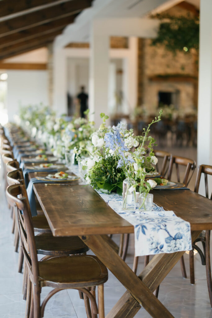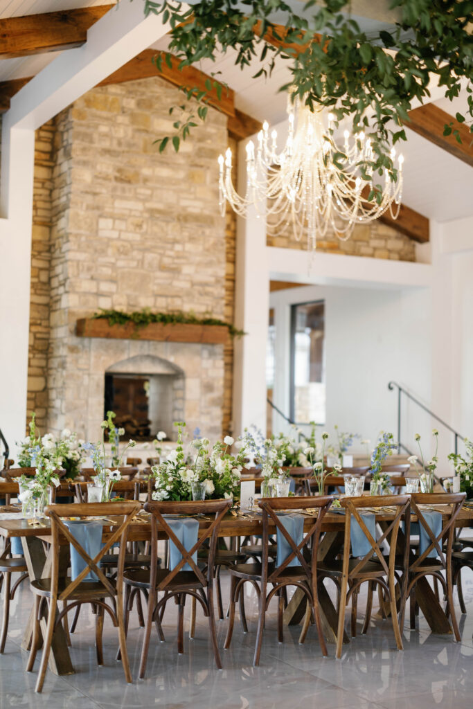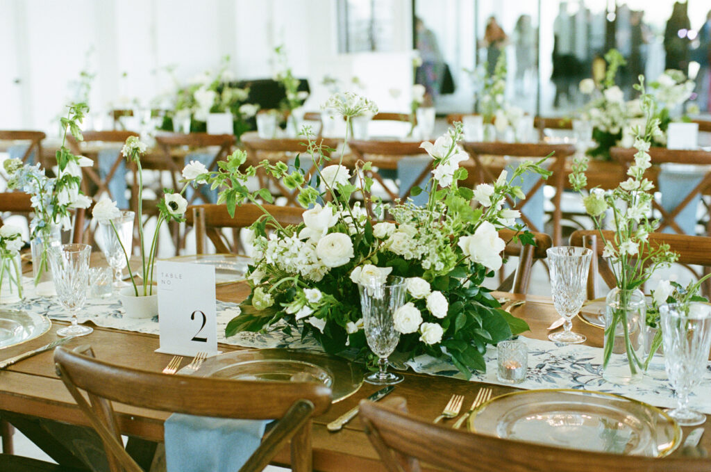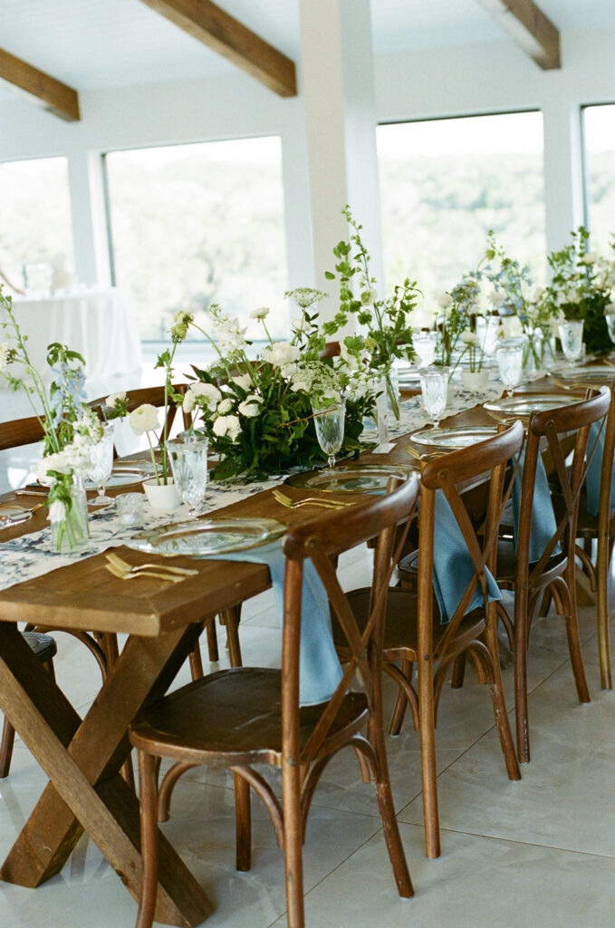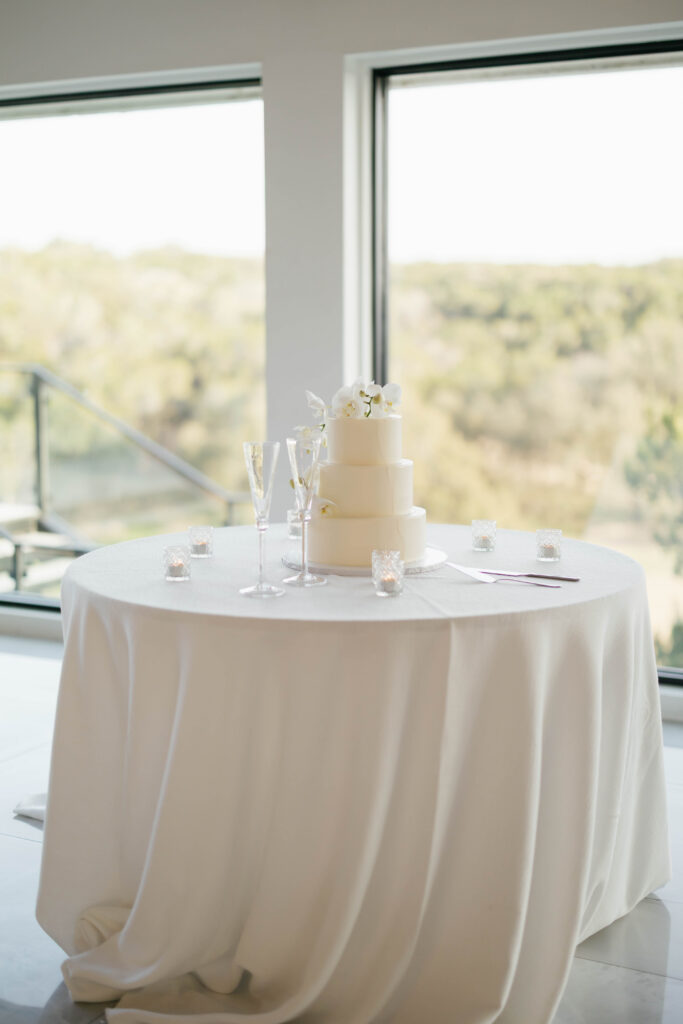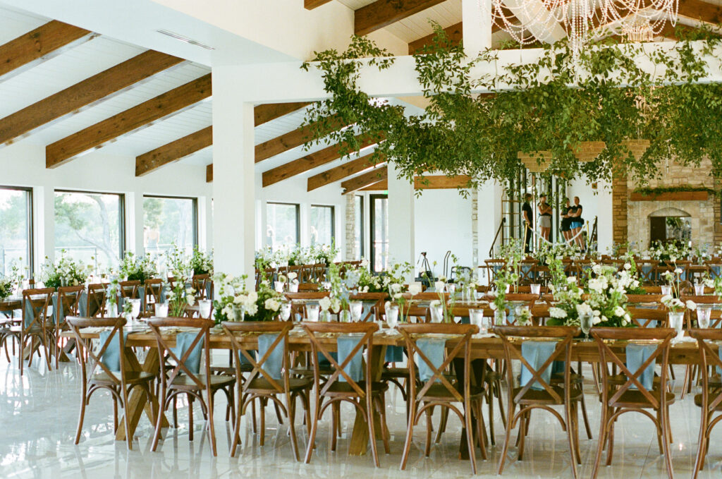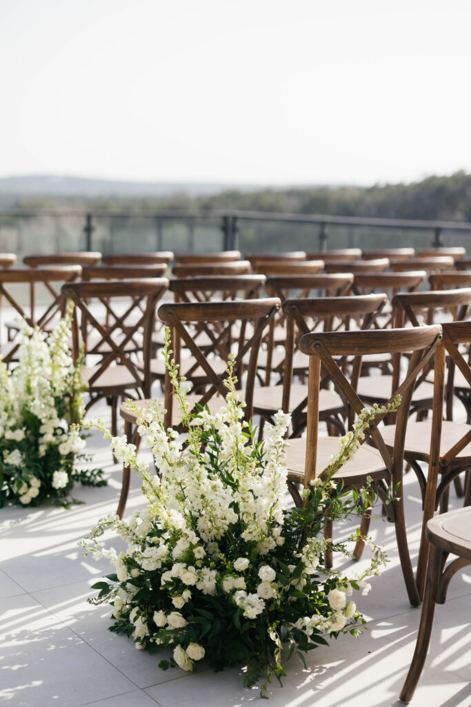 The design leaned into creamy whites and soft neutrals, letting texture and shape do the talking. Think cloud-like white florals, crisp linens, and that “bright sunny skies” glow that makes everything feel freshly polished. Western details showed up in a way that felt intentional, not themed: classic silhouettes, clean lines, and a little ranch romance, all elevated by the estate’s modern spaces and floor-to-ceiling views.